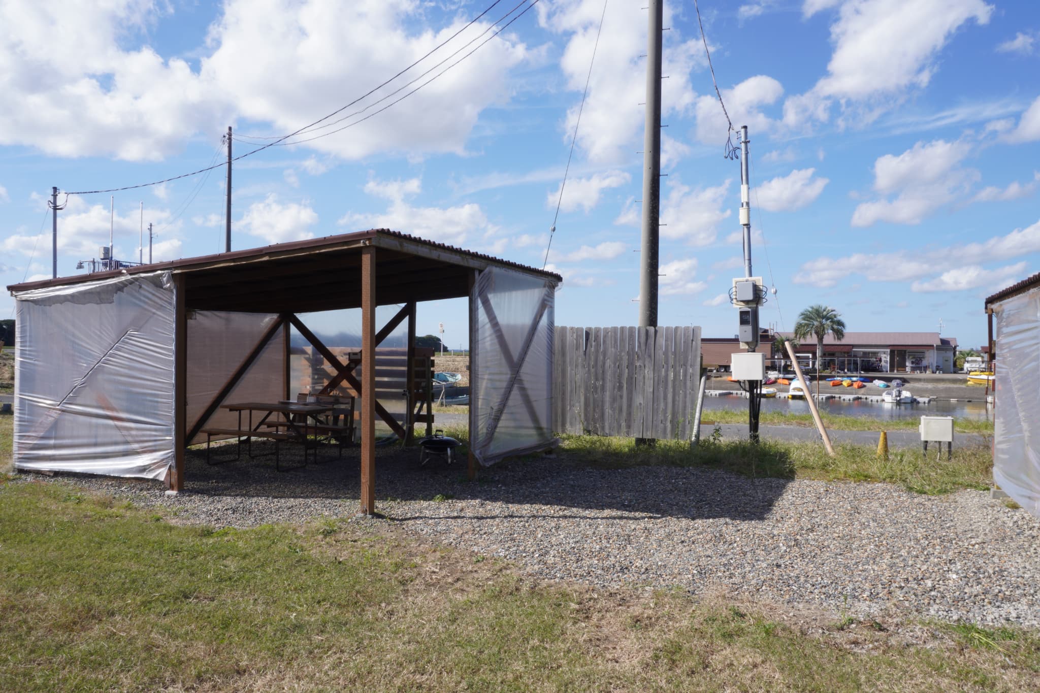 また、屋根と風よけビニールつきのスペースもあり、雨でもBBQを楽しめます。